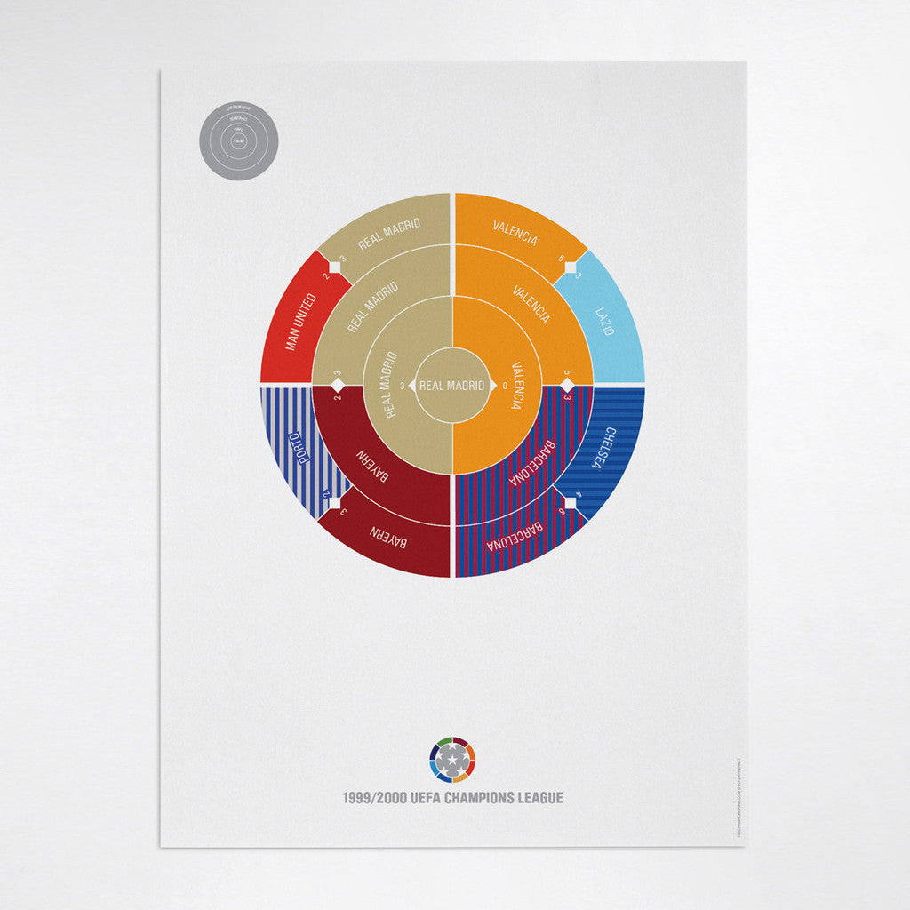 This print captures the entire 1999/2000 Champions League elimination rounds on a beautiful 18" x 24" art print. It's the perfect gift for Real Madrid fans.