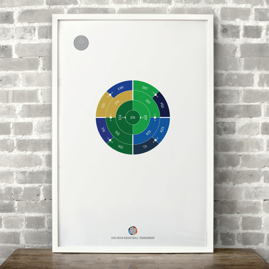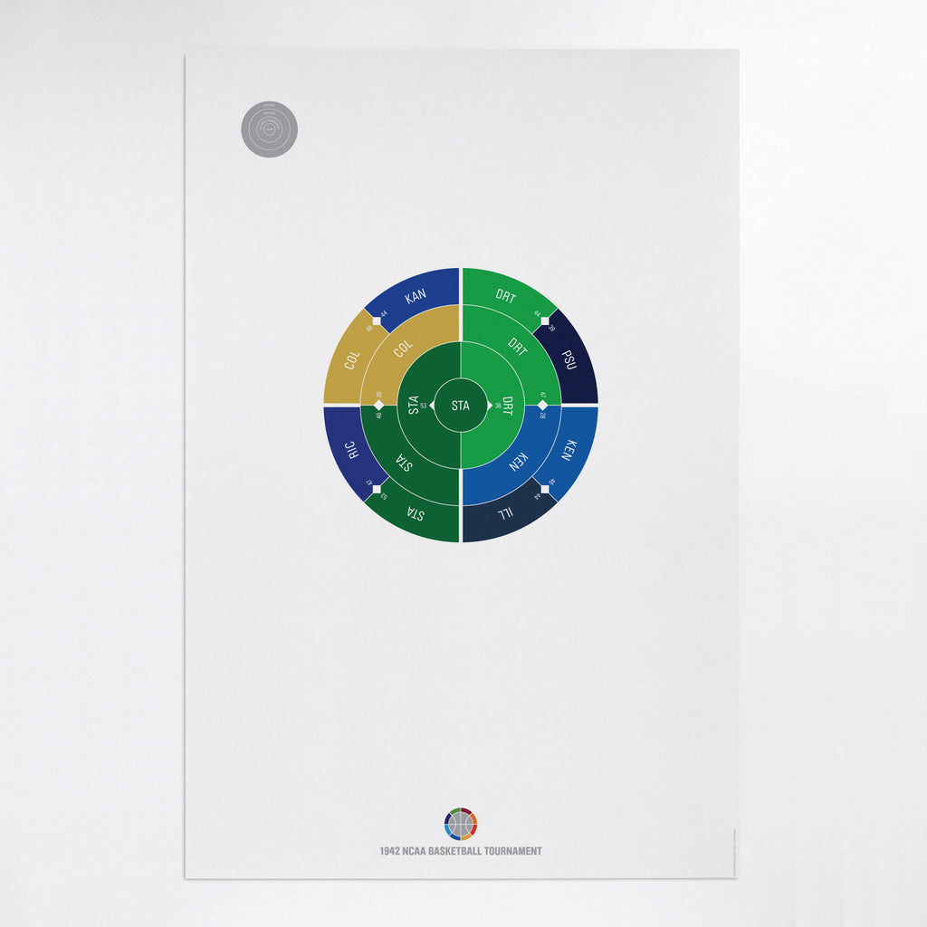 This print captures the entire 1942 men's NCAA basketball tournament on a beautiful 24" x 36" art print. It's the perfect gift for Stanford fans.