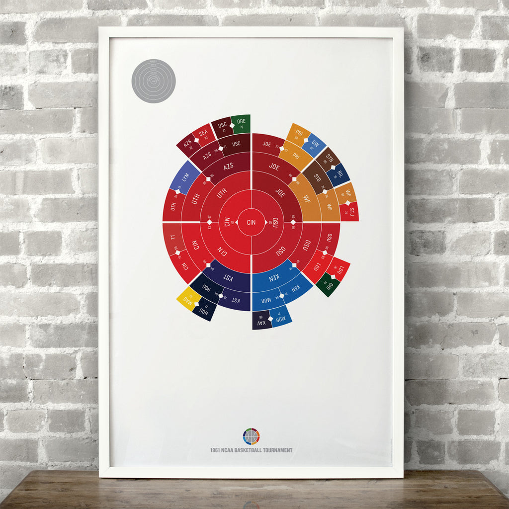 This print captures the entire 1961 men's NCAA basketball tournament on a beautiful 24" x 36" art print. It's the perfect gift for Cincinnati fans.