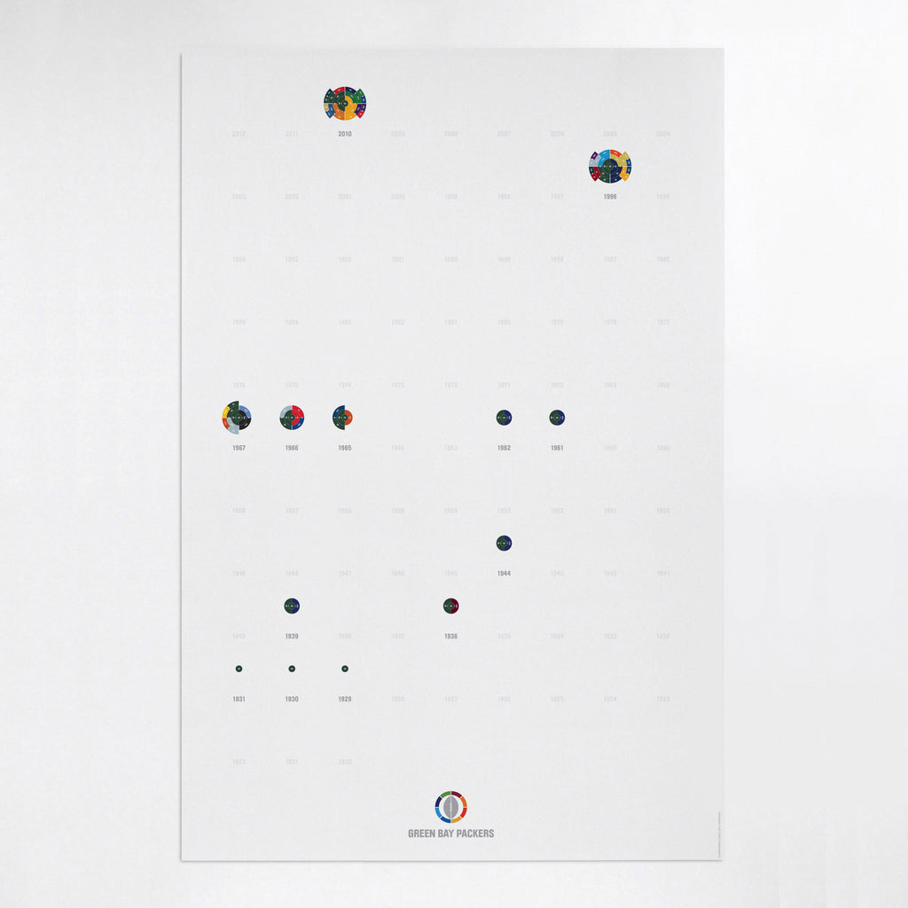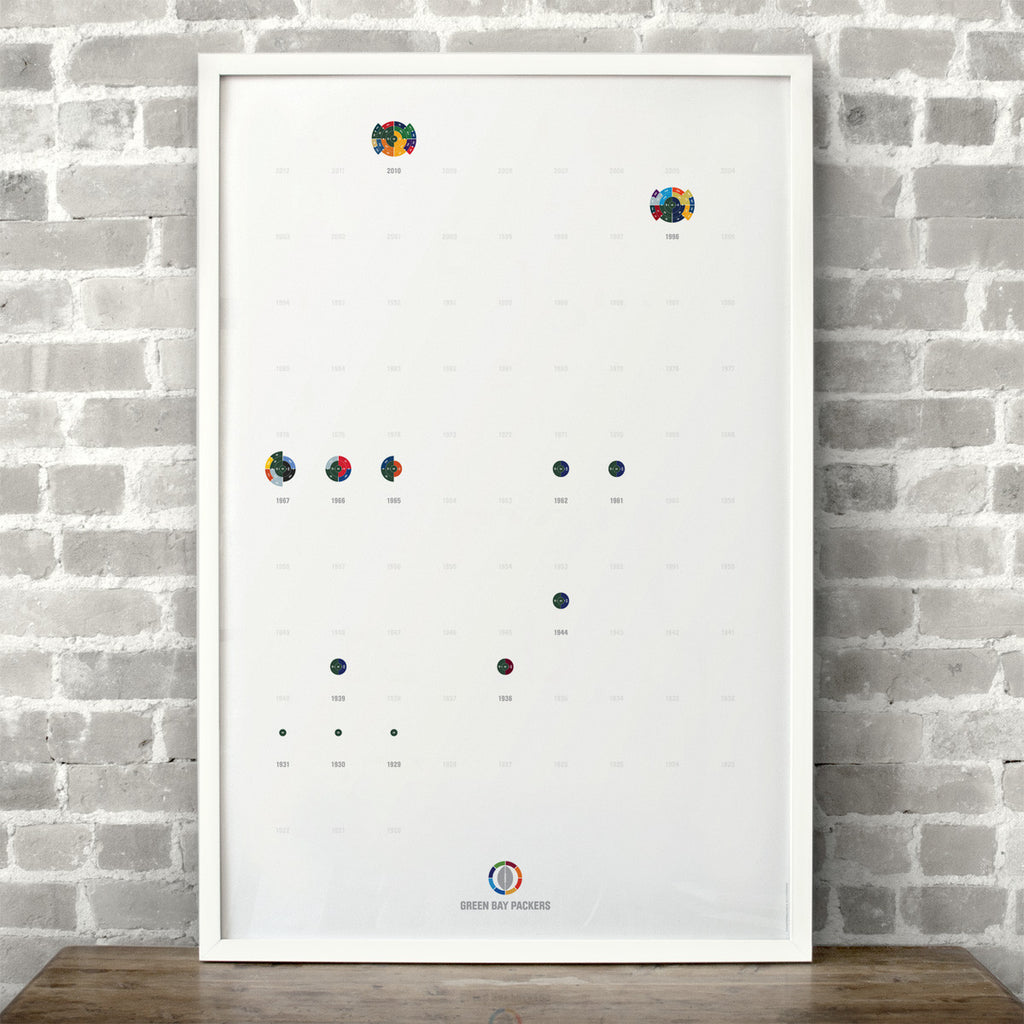This print captures every NFL championship won by the Green Bay Packers. That's a total of 13 brackets, starting with their first championship in 1929, on a beautiful 24" x 36" art print. It's the perfect gift for the ultimate Packers fan.