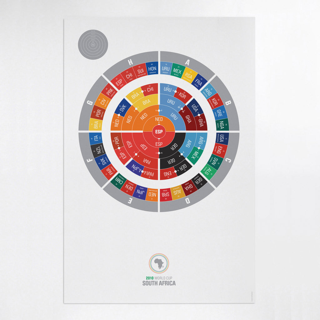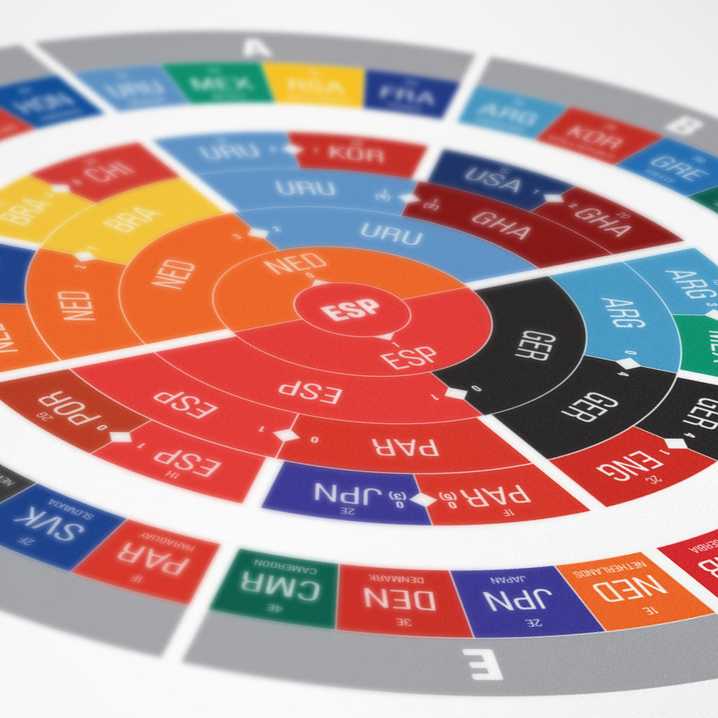 This is where it all began – the first radial sports bracket ever! This very first Champions Ring was designed by Hyperakt's Deroy Peraza while he obsessively watched the 2010 World Cup. This print captures the entire 2010 World Cup, including the group stages, the elimination rounds and Spain's historic victory. The print is 24" x 36" and beautifully printed in CMYK plus a spot silver ink on an 80lb cover uncoated, 100% recycled Astrolite stock. It is part of a limited run of 500. The frame is not included.
