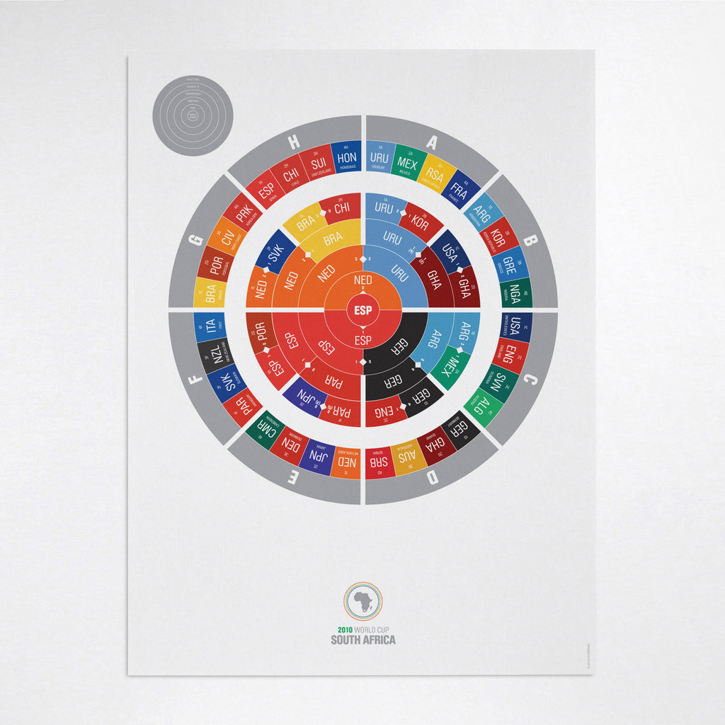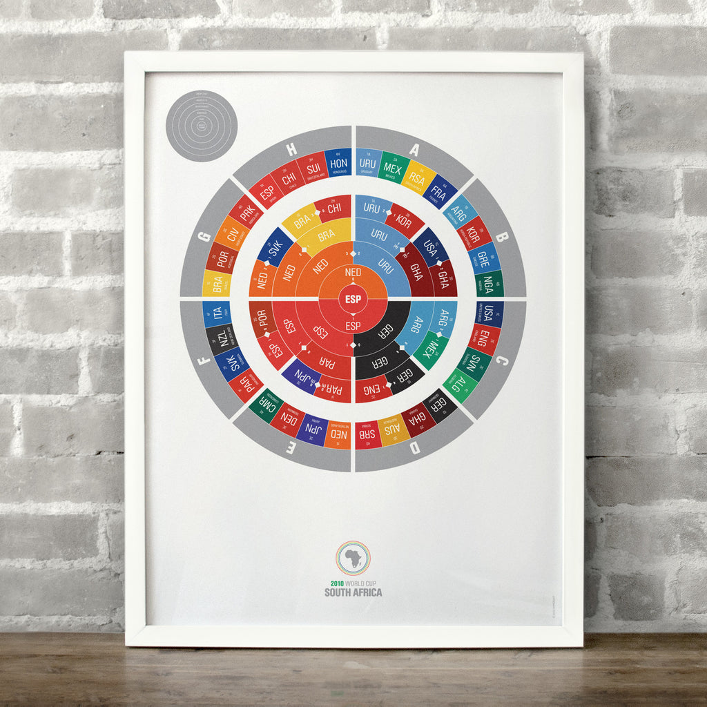 This is where it all began – the first radial sports bracket ever! This very first Champions Ring was designed by Hyperakt's Deroy Peraza while he obsessively watched the 2010 World Cup. This print captures the entire 2010 World Cup, including the group stages, the elimination rounds and Spain's historic victory. The print is 18" x 24" and beautifully printed in CMYK plus a spot silver ink on an 80lb cover uncoated, 100% recycled Astrolite stock. It is part of a limited run of 500. The frame is not included.